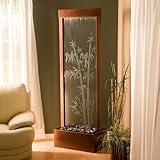 BluWorld Bamboo Garden Indoor/Outdoor Water Fountain - Additional features Quiet submersible pump is included Filter and polished river rocks are included No plumbing needed - water circulates through the fountain Humidifies as it cleanses the air Transport yourself to the misty Orient when you bring home the BluWorld Bamboo Garden Indoor/Outdoor Water Fountain. Its laser-etched designs on tempered glass of bamboo leaves and stalks give your surroundings a mystical yet peaceful air. Water flows gently over the smooth side of the etched glass for clean operation. The metal frame and reservoir have a dark copper powder-coated finish, and an adjustable water flow lets you create the right atmosphere. Filter and polished river stones are included, too. Waterfall and its electric pump are rated for all weather conditions and can be used indoors or out. The fountain is lightweight and easy to install in three steps. Enjoy the nighttime ambiance provided by the low voltage accent light on the 72- and 90-inch fountains. The 48-inch fountain is not lit. Fountain Dimensions Large: 32L x 18W x 90H inches, 163 lbs. Medium: 24L x 15W x 72H inches, 114 lbs. Small: 18L x 12W x 48H inches, 37 lbs Metal frame in dark copper powder-coated finish. Tempered glass panel with laser etched bamboo design. Perfect for use indoors and outdoors. Choice of 48-, 72-, or 90-inch tall fountains. Low voltage accent light on 72- and 90-inch models.